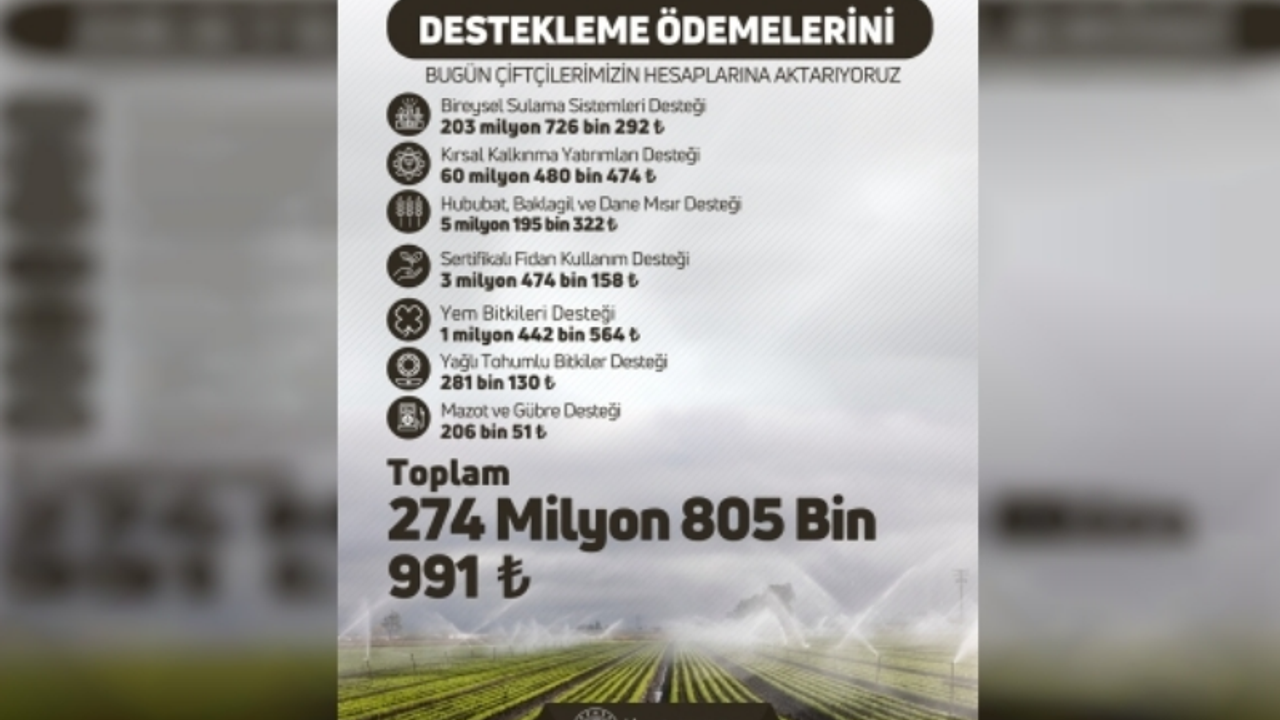 Tarım ve Orman Bakanlığı tarafından 203 milyon 726 bin 292 lira bireysel sulama desteği, 60 milyon 480 bin 474 lira kırsal kalkınma desteği, 5 milyon 195 bin 322 lira değerinde hububat, baklagil ve dane mısır desteği, 3 milyon 474 bin 158 lira değerinde sertifikalı fidan kullanım desteği ve 1 milyon 422 bin 564 lira değerinde yem bitkileri desteği, 281 bin 130 lira değerinde yağlı tohum bitkileri desteği ve 206 bin 51 lira mazot ve gübre desteği olmak üzere toplam 274 milyon 805 bin liralık çiftçilere destek verilecek. Tarım ve Orman Bakanı İbrahim Yumaklı konuya ilişkin yaptığı açıklamada, "Kaliteli, verimli, sürdürülebilir üretim için desteklerimizle çiftçilerimizin yanındayız. 274 milyon 805 bin TL tarımsal destek ödemesini bugün çiftçilerimizin hesaplarına aktarıyoruz. Hayırlı ve bereketli olsun" ifadelerini kullandı.