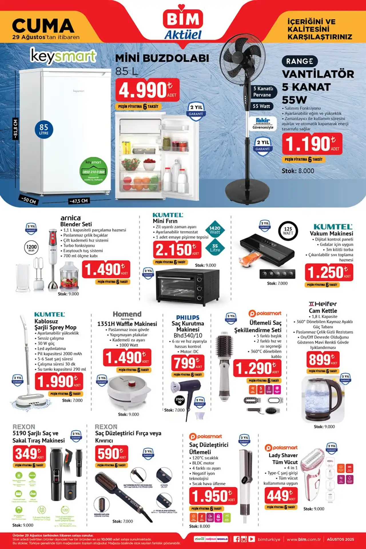29 Ağustos 2025 kataloğu bu hafta yerini garantiye alarak asıl indirimin ne olduğunu açıkladı. Cuma günü raflarda olmaması için hiç bir sebep olmayan BİM kataloğunda mini buzdolabı ve vantilatör, TCL 55” TV ve Samsung S21FE akıllı telefon, 8 bölmeli çok amaçlı dolap ve kilitli 3 kapaklı metal ayakkabılık, inverter kaynak makinesi ve sıcak hava tabancası vitrinde yer alıyor. Valizler ve mutfak gereçlerinin de vitrin adayı olduğu Bim 29 Ağustos 2025 kataloglarında her fırsat çok özel.