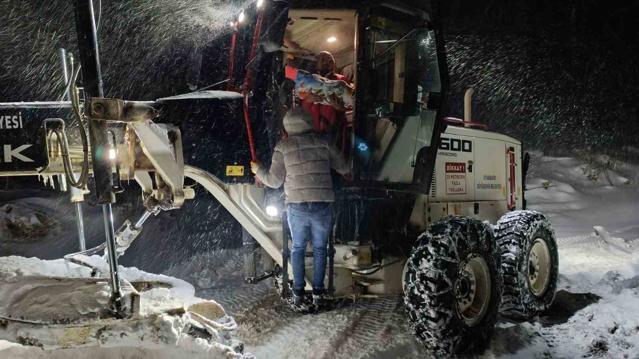 Diyarbakır'ın Hazro ilçesinde sağlık ekipleri, rahatsızlanan 1 yaşındaki Mina'ya greyder eşliğinde ulaştı.
