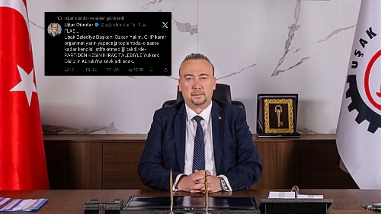 Uşak siyasetinde tansiyon yükseldi. Gazeteci Uğur Dündar’ın sosyal medya hesabından paylaştığı iddia, Uşak’ta ve siyasi kulislerde geniş yankı uyandırdı. Paylaşıma göre, Uşak Belediye Başkanı Özkan Yalım’ın, Cumhuriyet Halk Partisi’nin (CHP) yarın gerçekleştireceği karar organı toplantısına kadar istifa etmemesi halinde, kesin ihraç talebiyle Yüksek Disiplin Kurulu’na sevk edileceği iddia ediliyor.