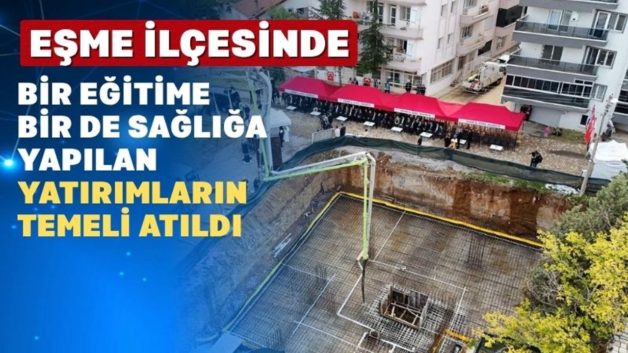 İlçeye kazandırılacak olan Eşme Meslek Yüksekokulu Yeni Hizmet Binası ile Eşme İlçe Sağlık Müdürlüğü ve 4 Hekimli Aile Sağlığı Merkezi projelerinin temelleri, protokol üyeleri, kurum temsilcileri ve vatandaşların katılımıyla atıldı.