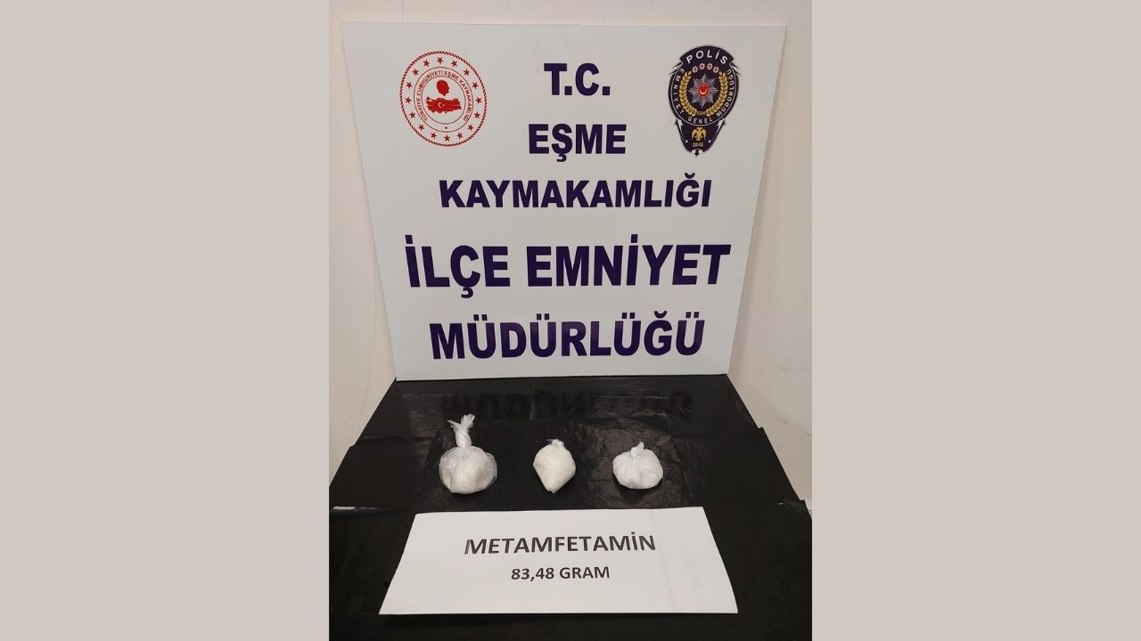 Eşme İlçe Emniyet Müdürlüğü ekipleri, ilçe genelinde gerçekleştirdikleri denetimler kapsamında, uygulama sırasında polis ekiplerinden kaçan daha sonra yapılan çalışmalar sonucu yakalanan şüpheli şahsın yapılan kontrollerinde *83.48 gram metamfetamin* ve *1 adet Sentetik Ecza ele geçirilirken, olayla ilgili 1 şüpheli gözaltına alındı.