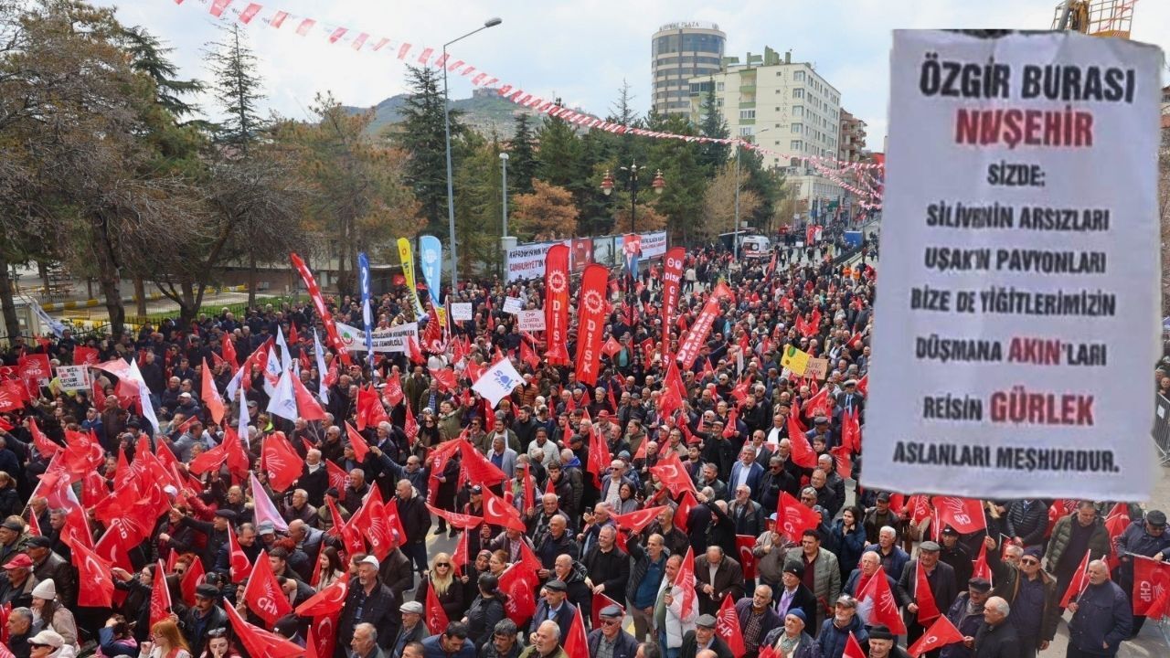 Özel’in konuşma yaptığı kürsünün tam karşısında bulunan binanın camına asılan pankartta, "Özgür burası Nevşehir. Sizde Silivri’nin arsızları. Uşak’ın pavyonları, bizde yiğitlerimizin düşmana akınları, Reisin Gürlek aslanları meşhurdur" ifadeleri yer aldı.