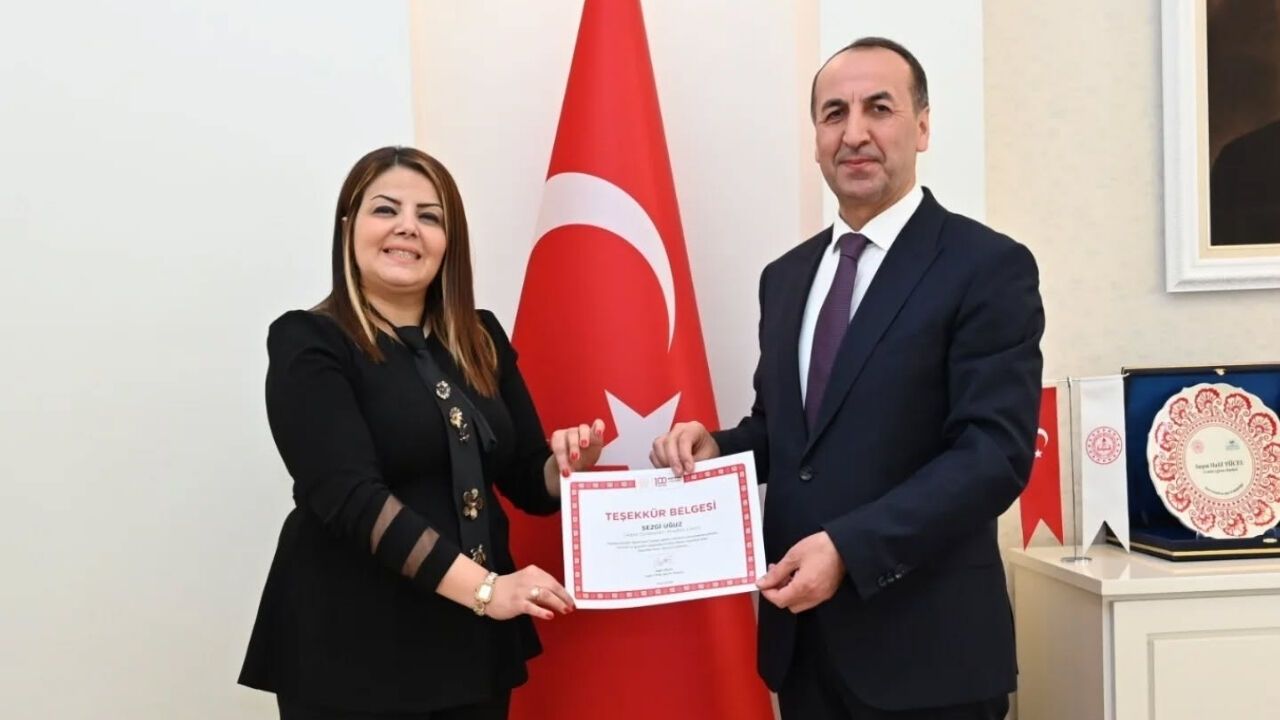 İl Millî Eğitim Müdürü Halil Yücel, Alper Günbayram Anadolu Lisesi Yeşilay Kulübü öğretmeni Sezgi Uğuz’a, sağlıklı nesillerin yetişmesine yönelik yürüttüğü gayretli çalışmalar dolayısıyla teşekkür belgesi ve kitap takdim etti.