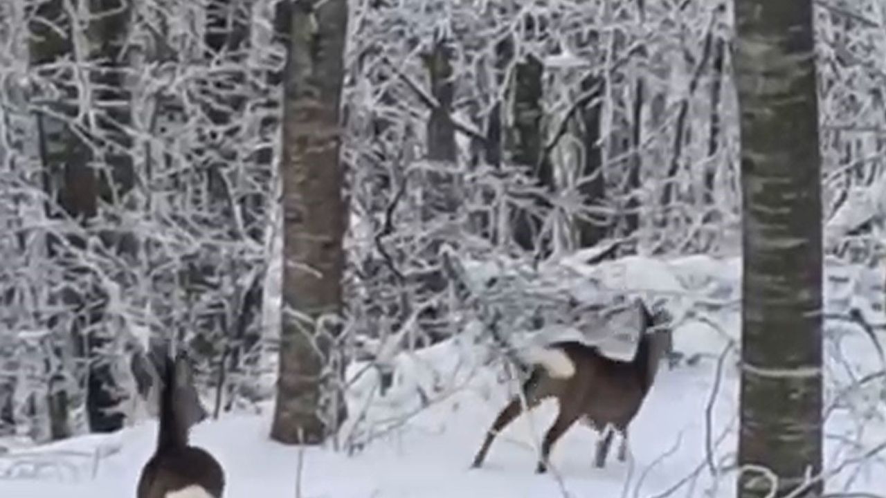 İlçe genelinde etkili olan kar yağışı ve soğuk hava, yaban hayatını da olumsuz etkiledi. Bölgede yaşayan bir vatandaş, yiyecek bulmakta zorlanan hayvanları beslemek amacıyla aracıyla yüksek kesimlere çıktı. Ormanlık alana yem bıraktığı sırada iki geyikle karşılaşan vatandaş, o anları cep telefonu kamerasıyla kaydetti.